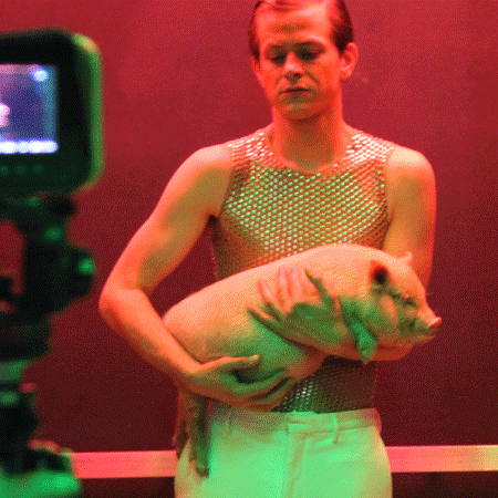 "A couple of days ago, Perfume Genius announced the new album Too Bright and shared the stark, powerful first single “Queen.” Mike Hadreas, the man who performs as Perfume Genius, has said that the album represents a confident, confrontational embrace of queer identity and of the effects it can have, and that sure as hell comes through in the video, which is a truly great piece of work. Cody Critcheloe, the man behind the performance-art pop project SSION, directed the video, a surreal masterpiece that starts with Hadreas playing a street hustler and jumps into the unknown from there. The video has pigs, smashed computers, giant shrimp dinners, a one-legged Elvis impersonator, and a troupe of cheerleaders celebrating a suicide. It demands to be picked apart."
